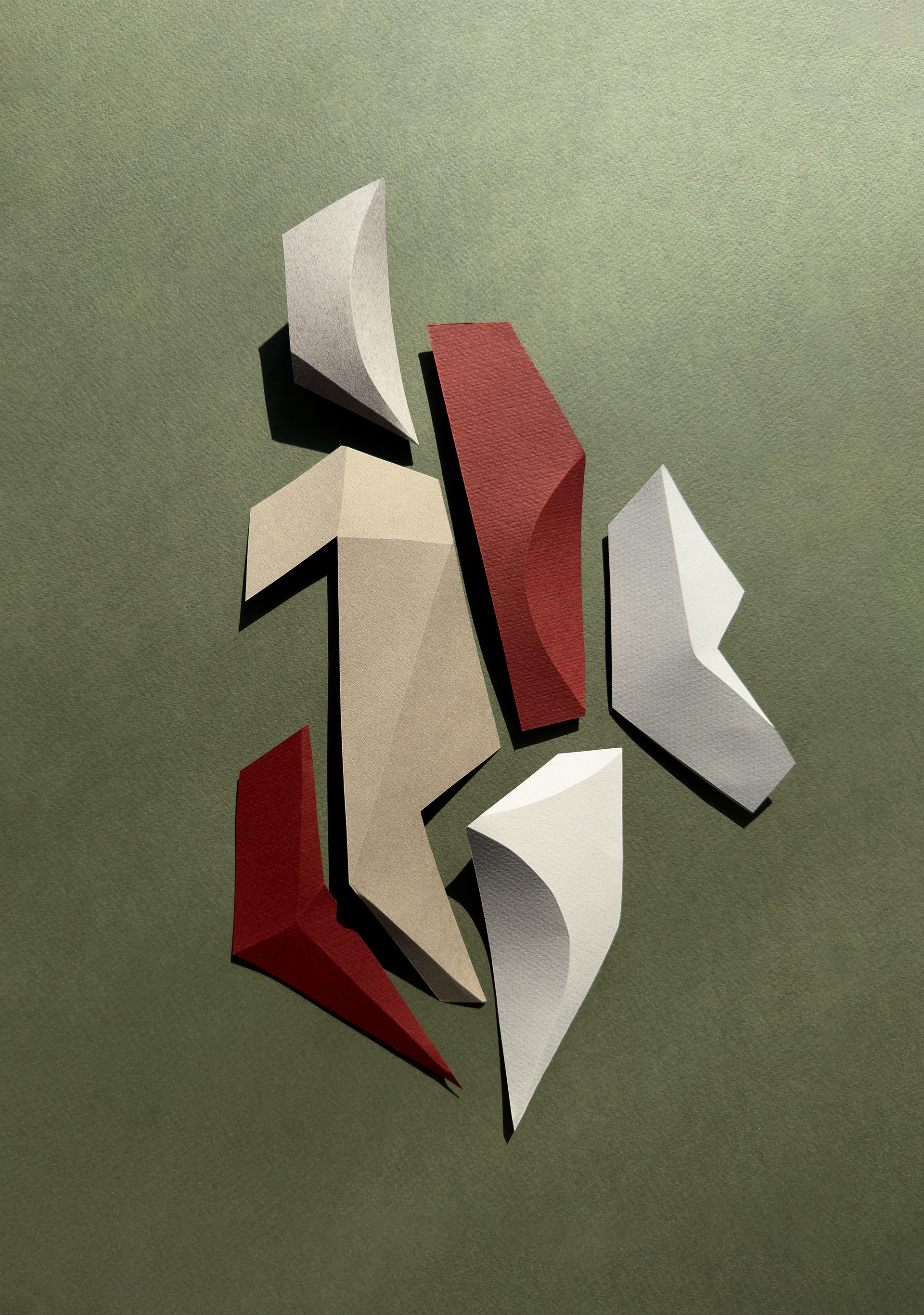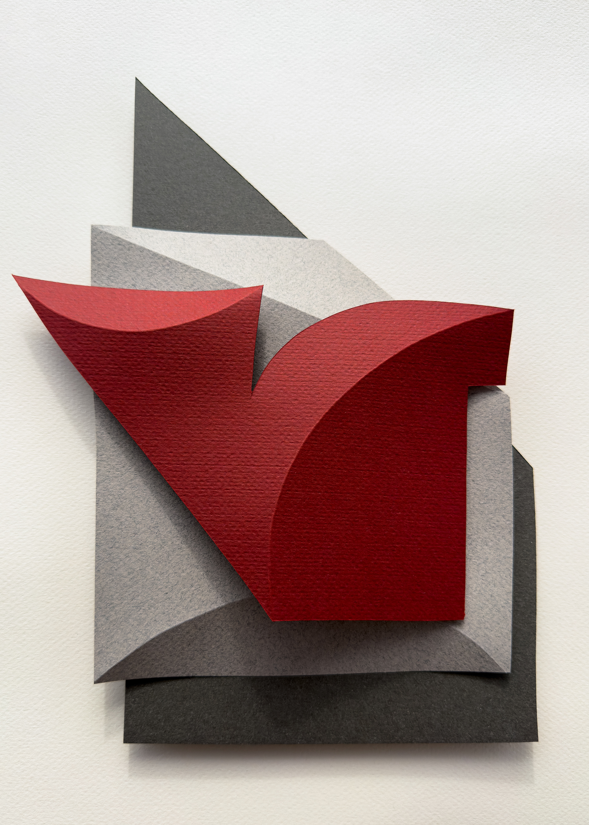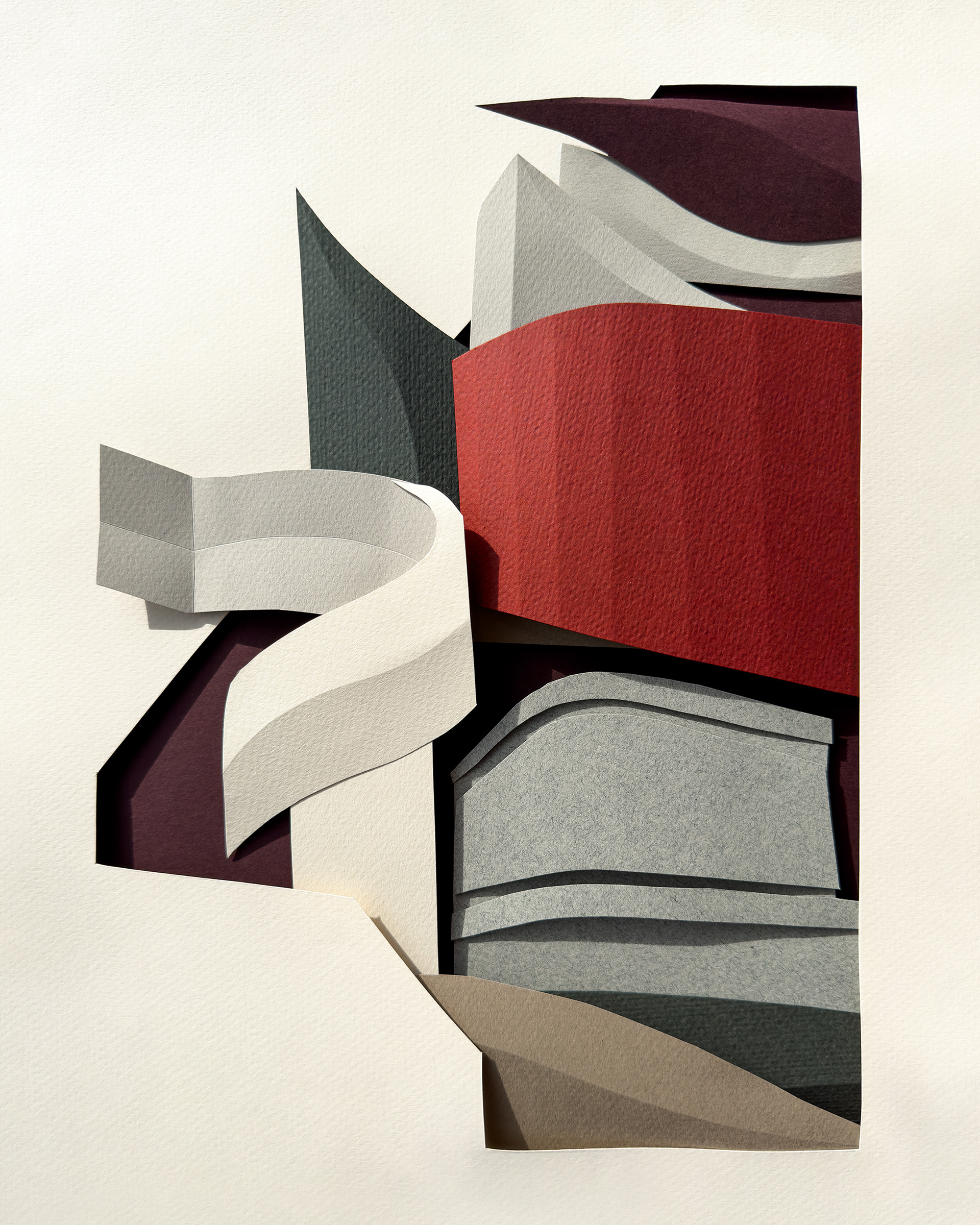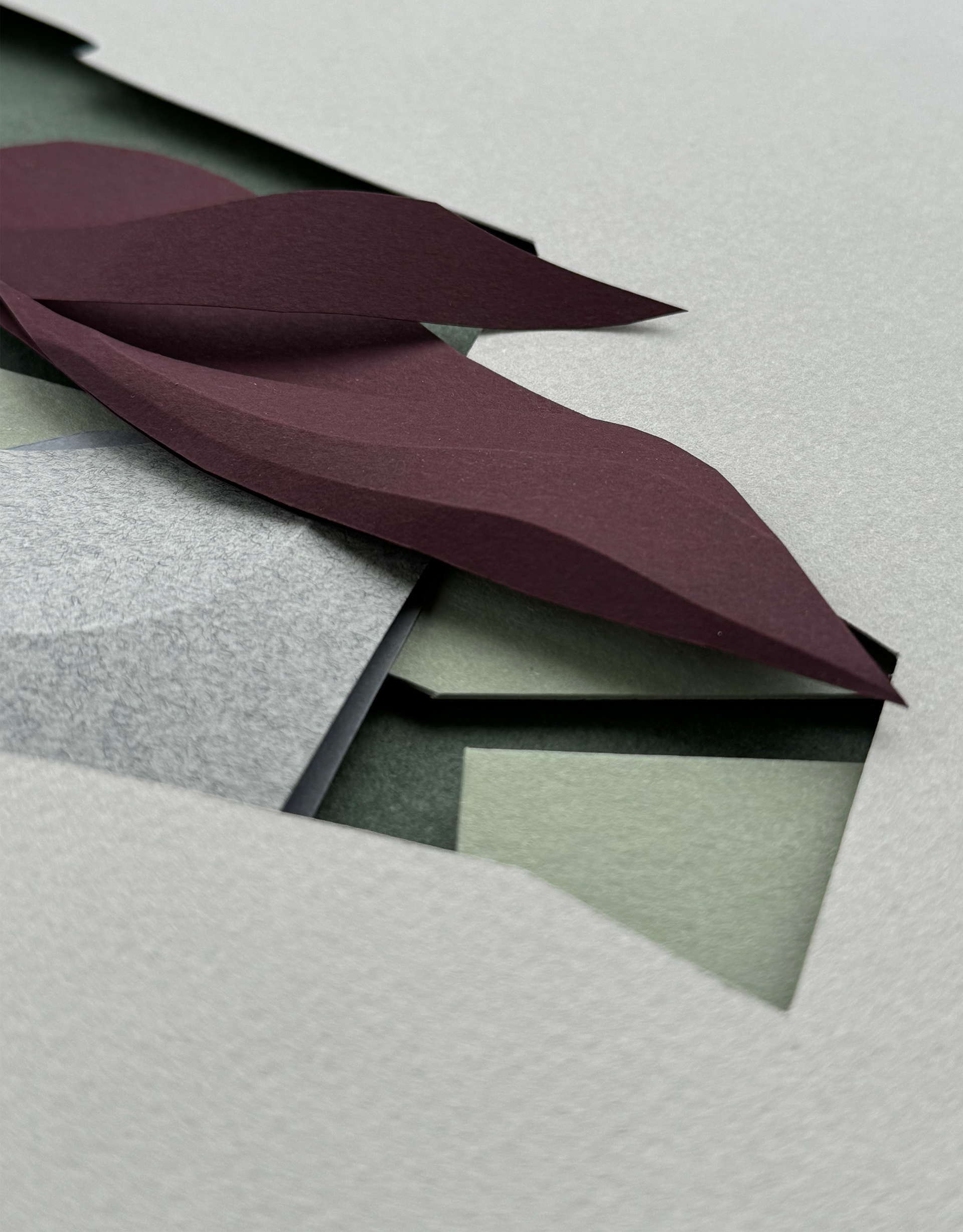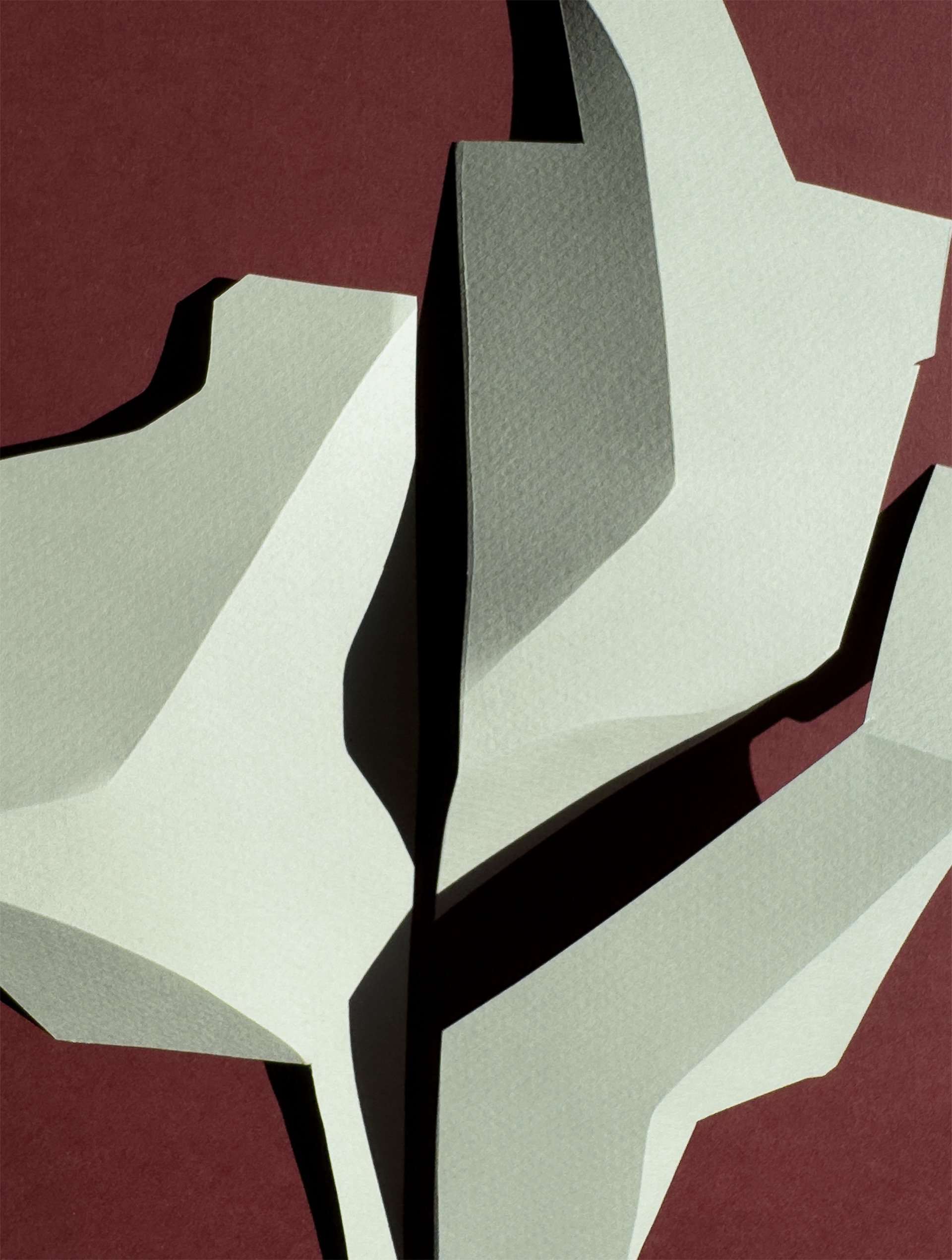 Each composition begins as a flat sheet of paper, but the creative vision behind it is spatial from the start. I work by hand, often from a loose sketch, shaping forms through cuts and folds. These sculptural structures catch light and shadow, giving depth and rhythm to otherwise flat surfaces. I deliberately avoid modular or mathematical precision – instead, I aim for fluidity and gesture, allowing each form to feel dynamic and intuitive. Though I have an analytical mindset, these works are not calculated – they emerge through a process that is both instinctive and expressive.