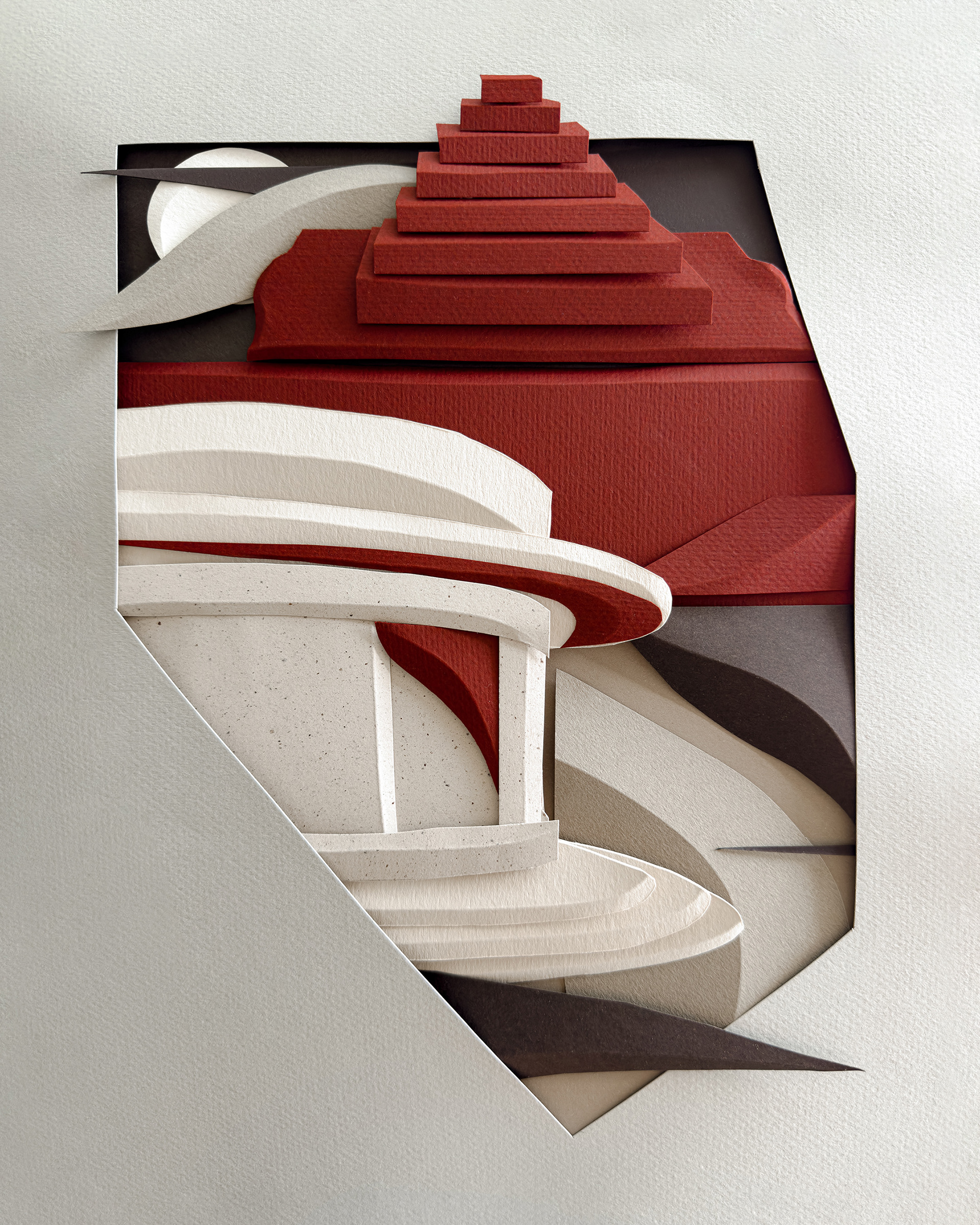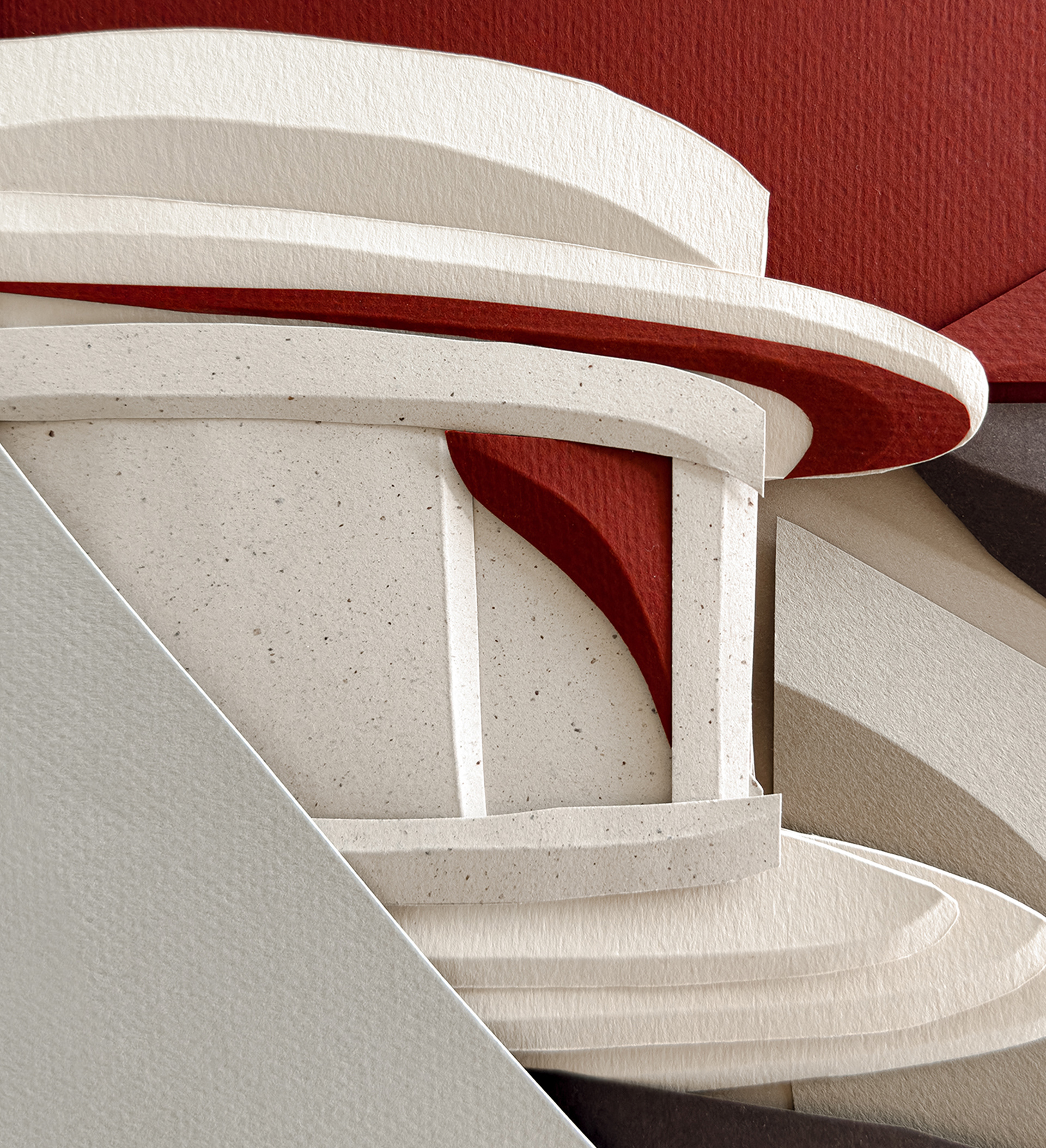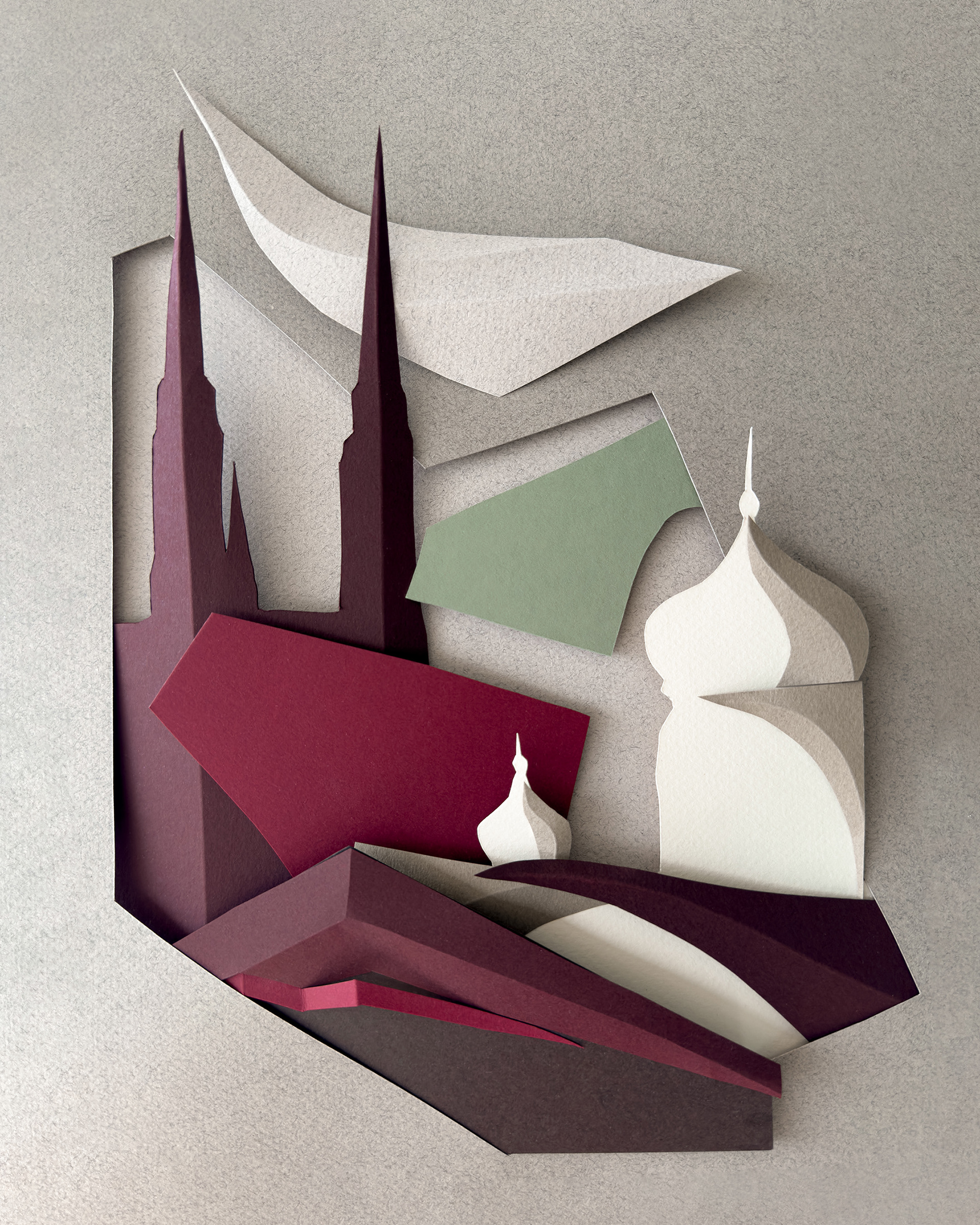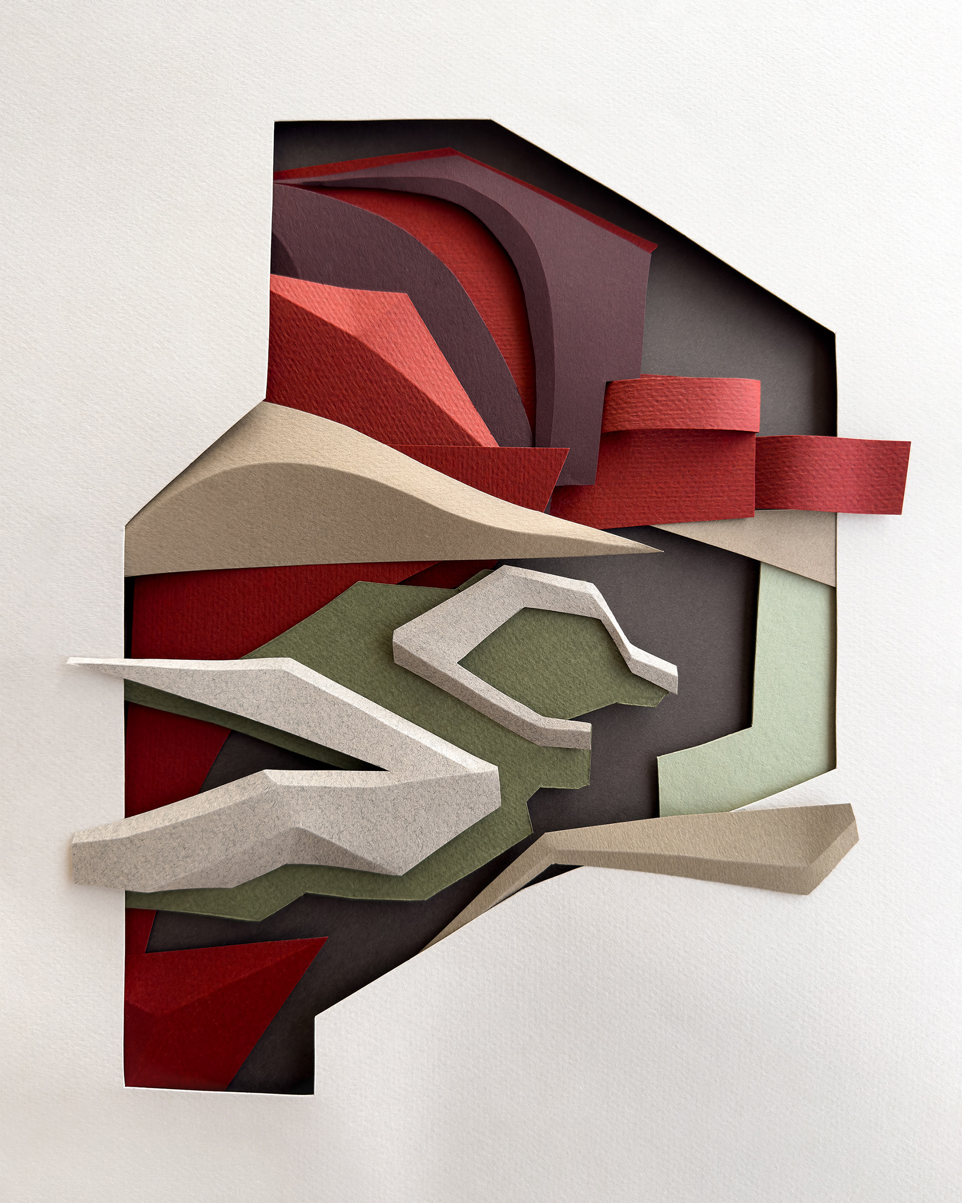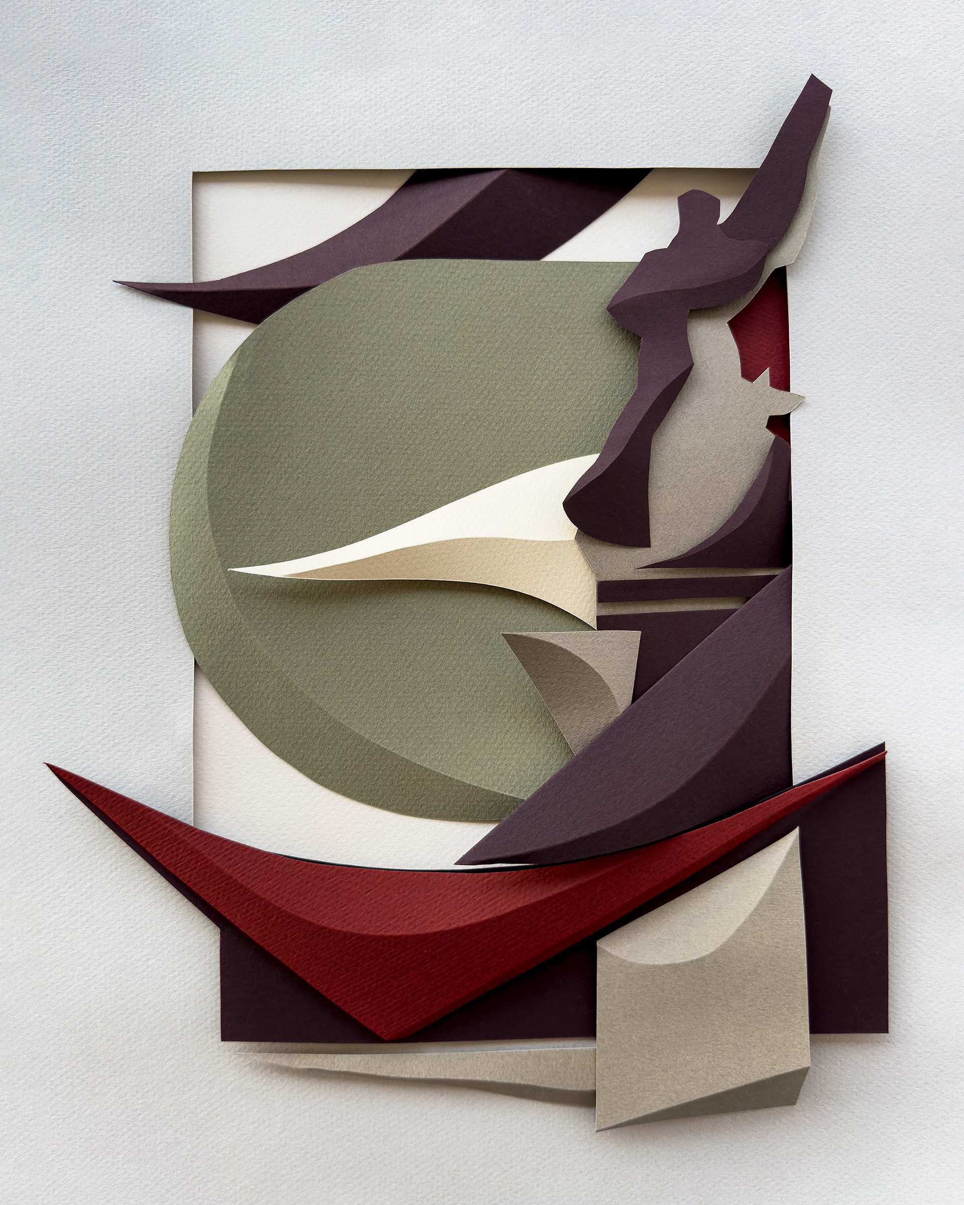 Each composition begins as a flat sheet of paper, but the creative vision behind it is spatial from the start. I work by hand, often from a loose sketch, shaping forms through cuts and folds. These sculptural structures catch light and shadow, giving depth and rhythm to otherwise flat surfaces. I deliberately avoid modular or mathematical precision – instead, I aim for fluidity and gesture, allowing each form to feel dynamic and intuitive. Though I have an analytical mindset, these works are not calculated – they emerge through a process that is both instinctive and expressive.
