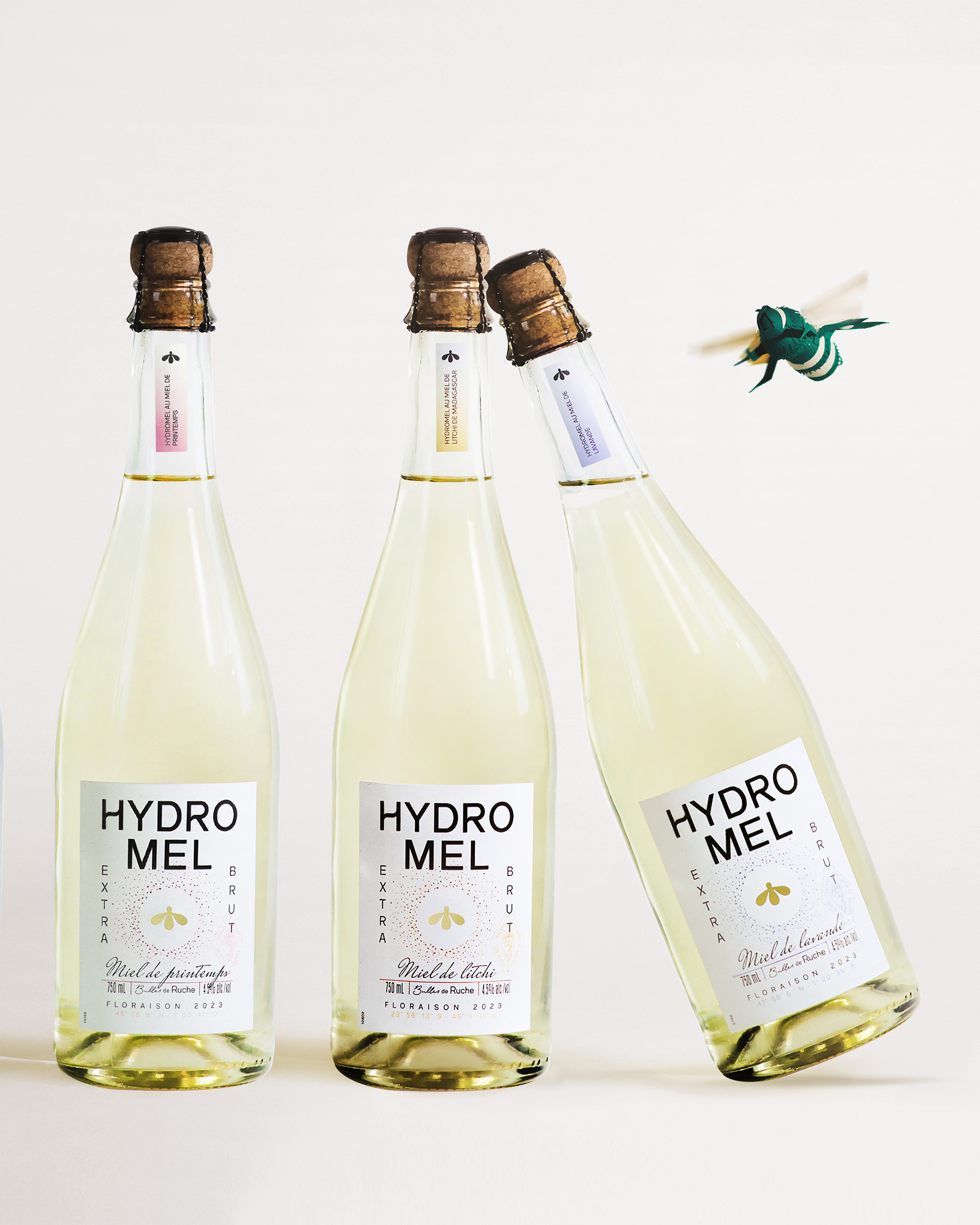 Handcrafted paper elements created for the Bulles de Ruche mead project. I designed and built two paper bees and a flower, matching the brand’s color palette, to be used as physical props during the product photoshoot, commissioned by Studio BOAM.