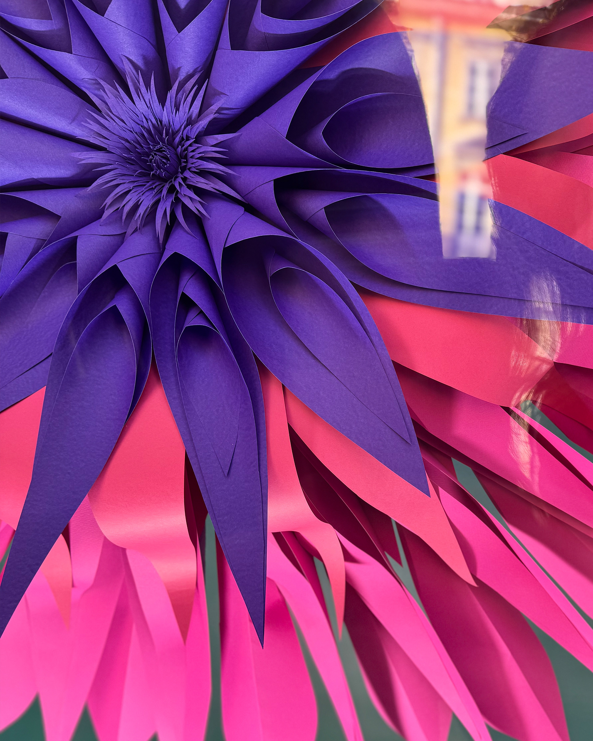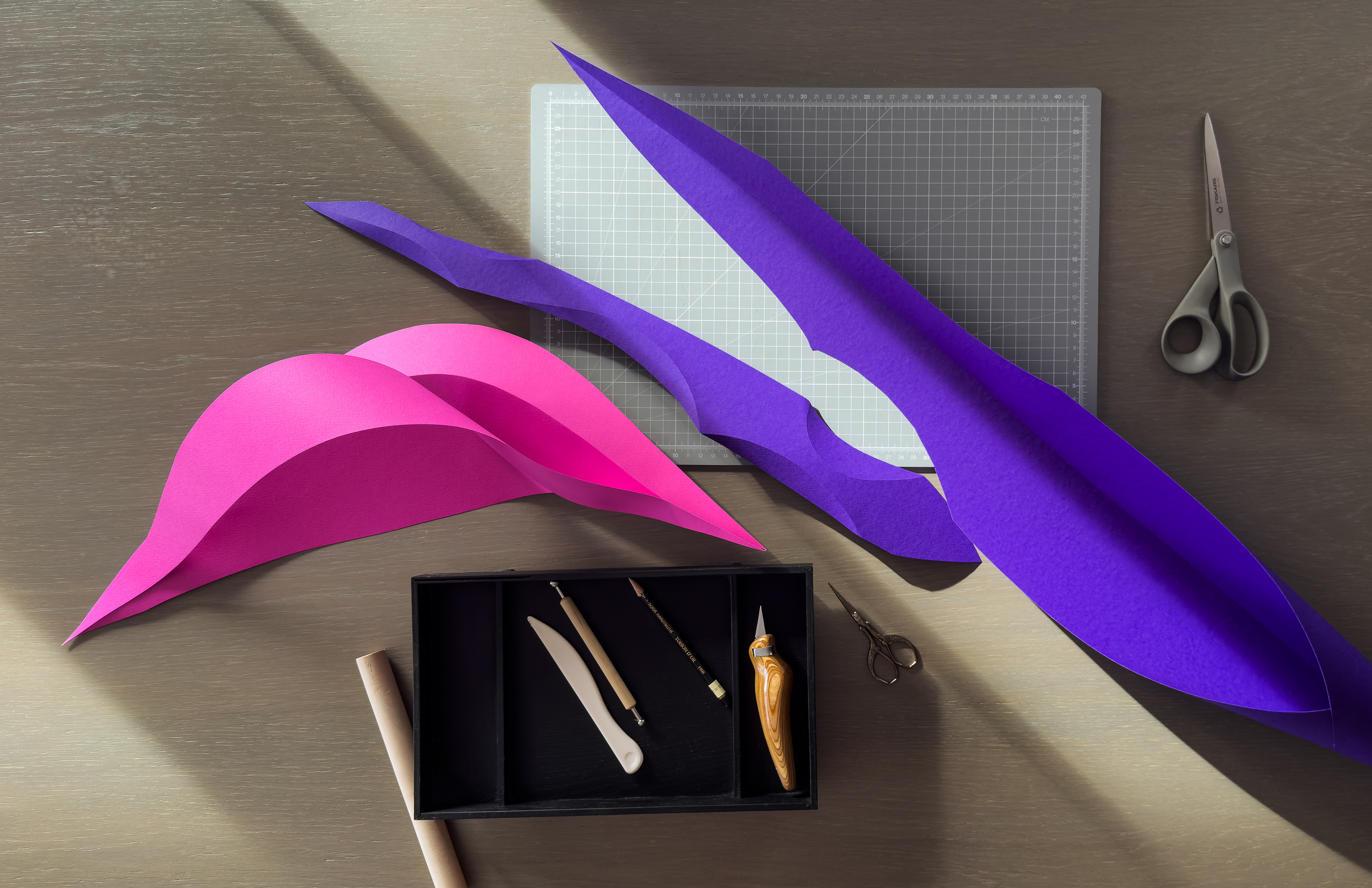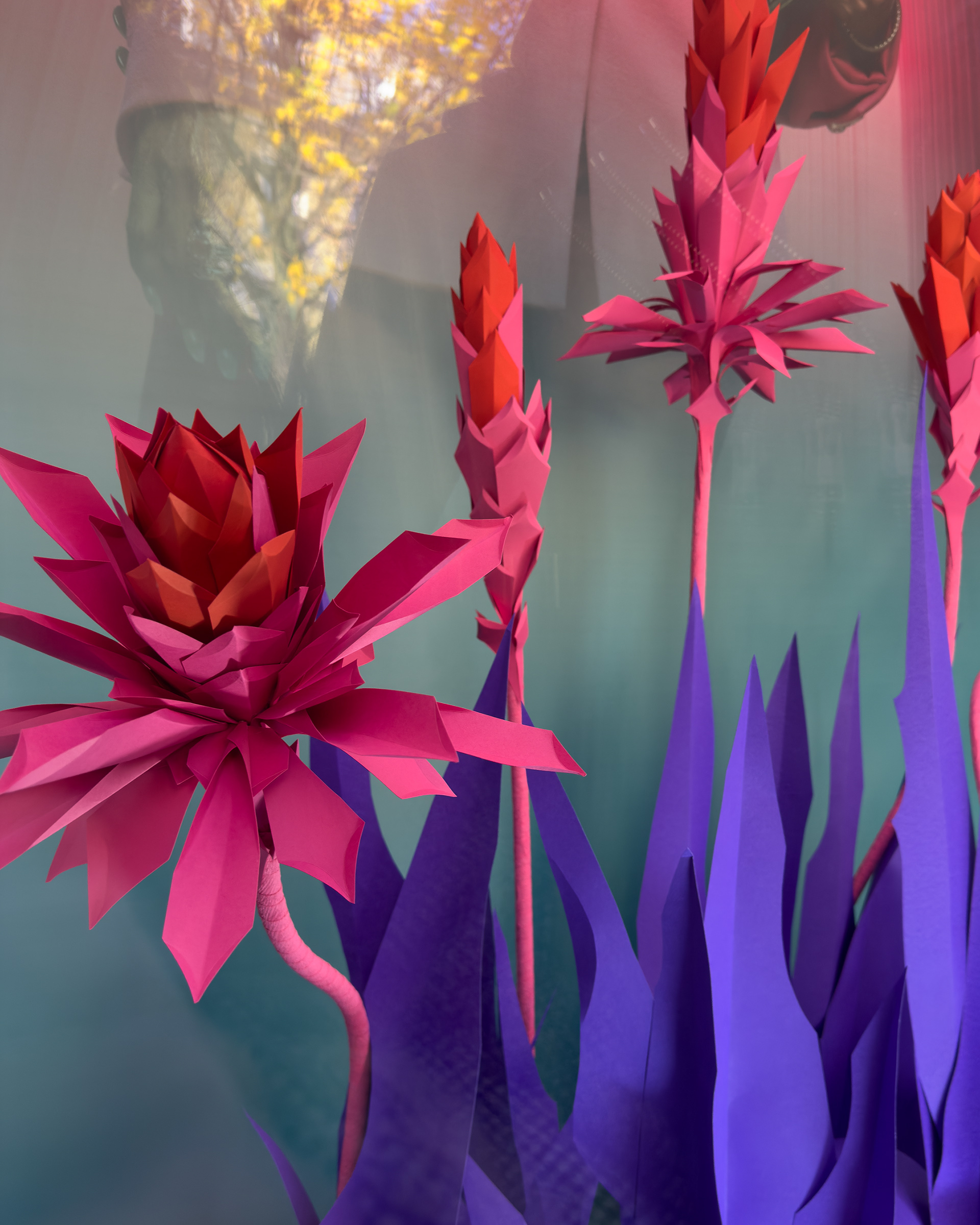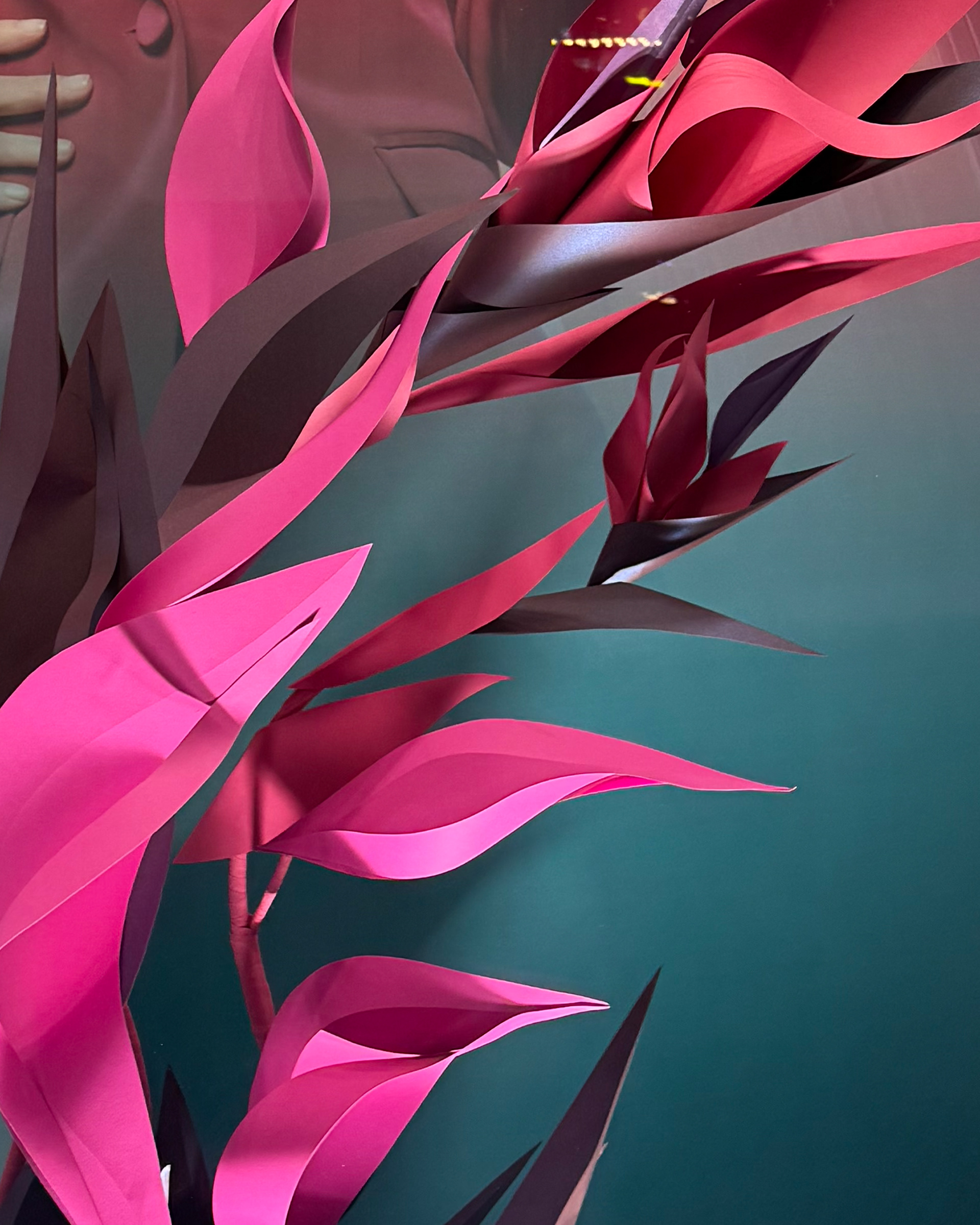 Every element was made by hand: cutting and folding, then sculpting paper with light in mind so a single sheet could reveal a full range of tonal nuances. I designed the installations for real viewing conditions — movement, sightlines, and depth — and built the project around intense, clean colors (fuchsia, scarlet, violet) to reflect the characters’ bold personalities.
