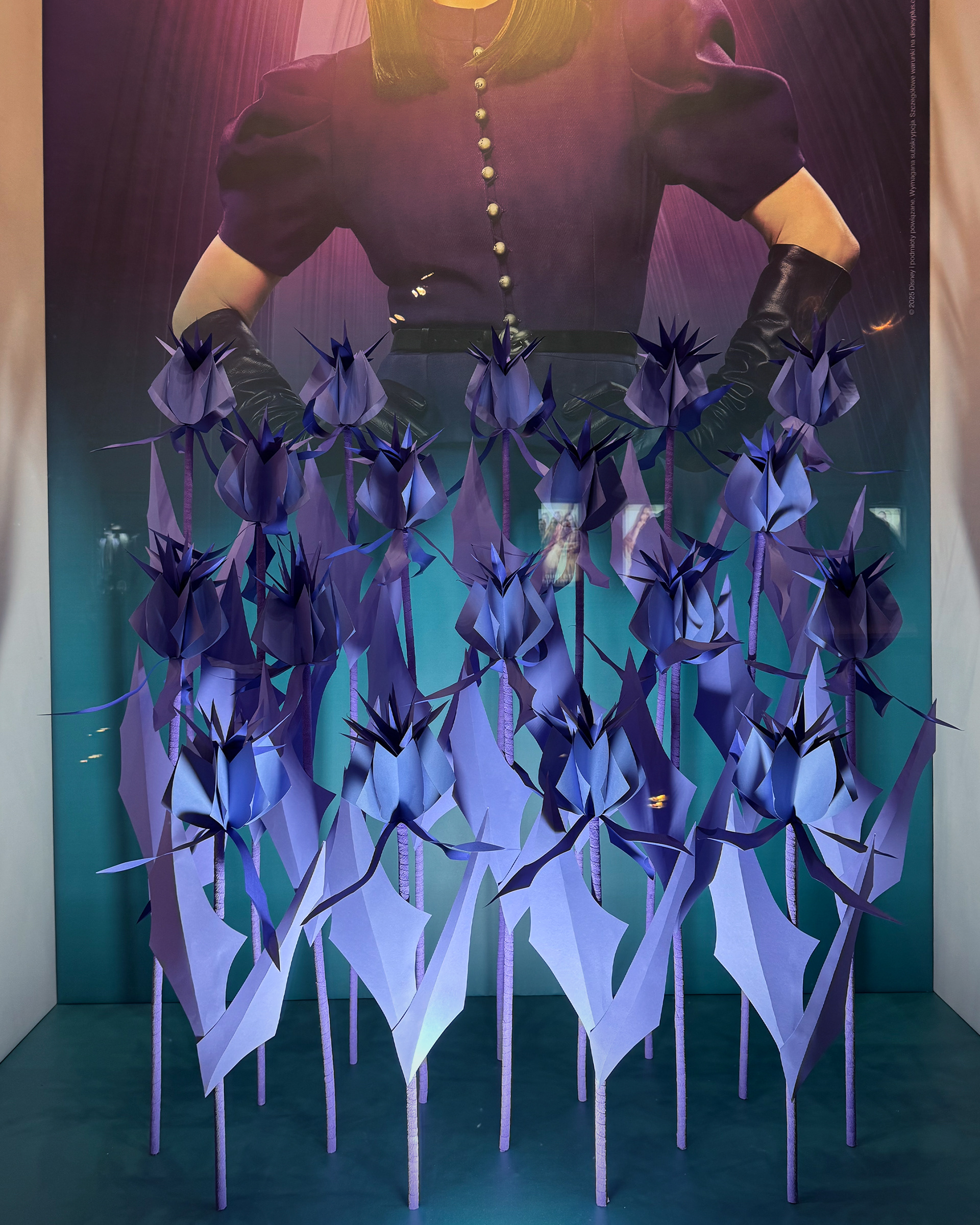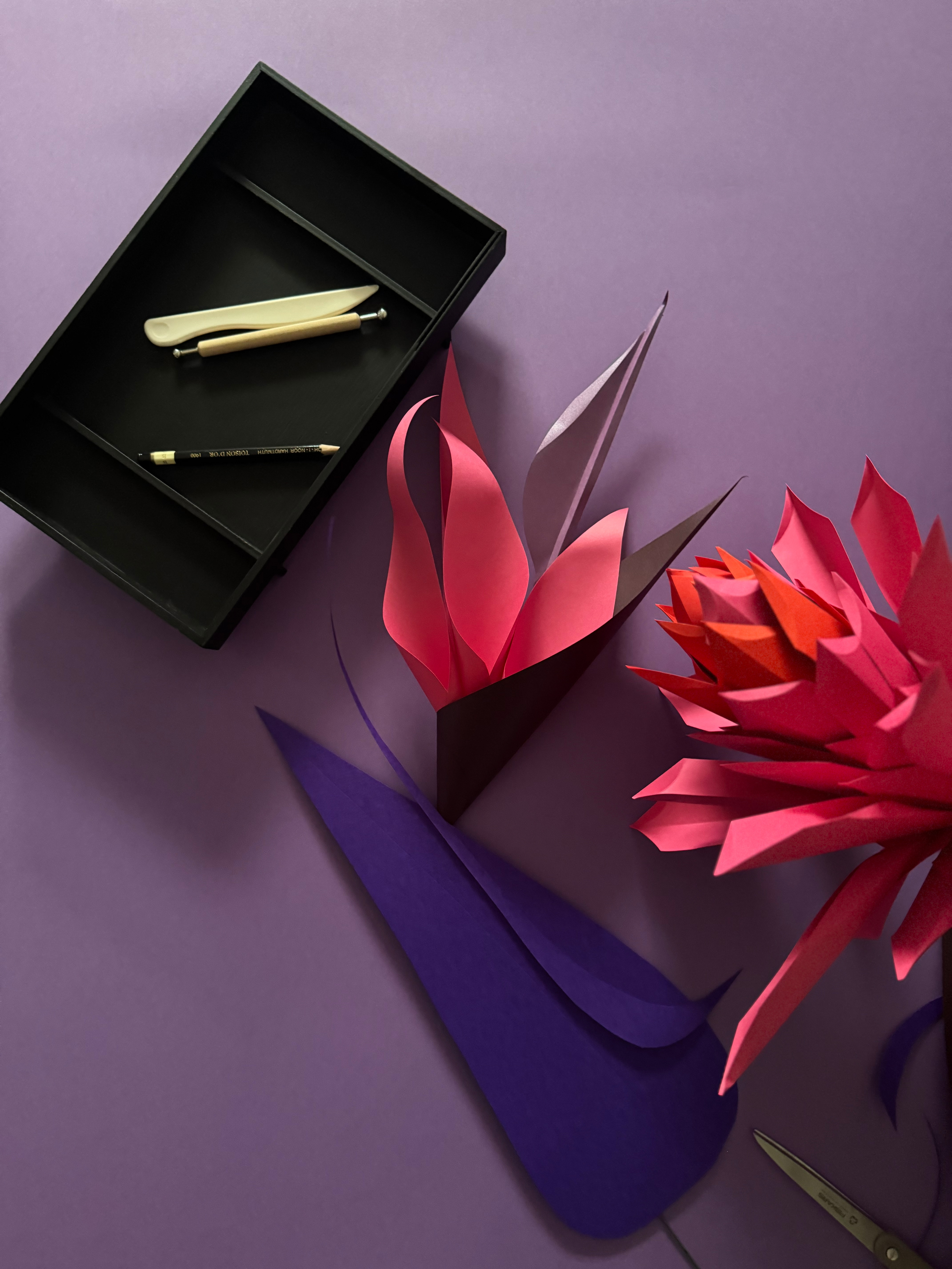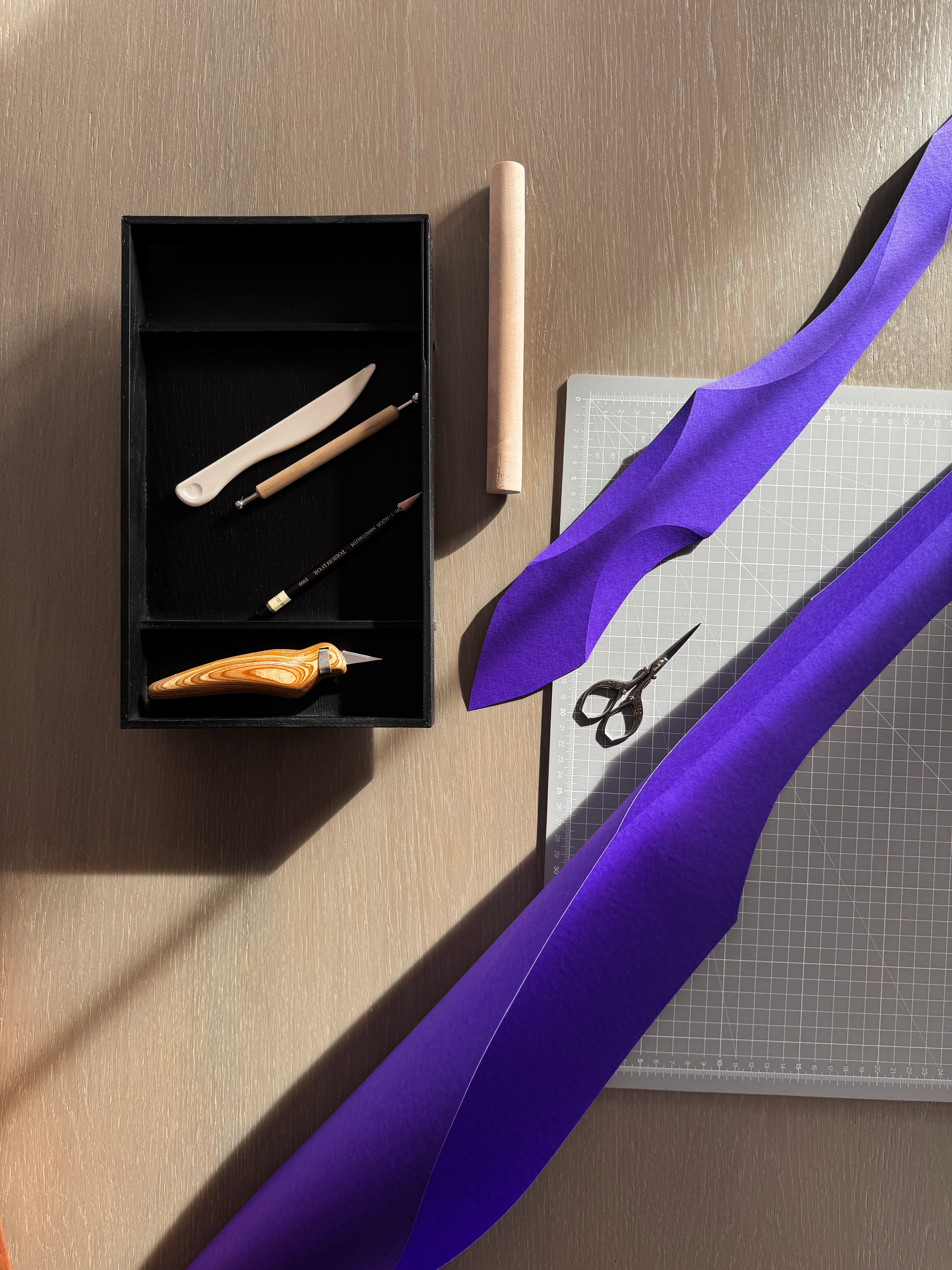 Every element was made by hand: cutting and folding, then sculpting paper with light in mind so a single sheet could reveal a full range of tonal nuances. I designed the installations for real viewing conditions — movement, sightlines, and depth — and built the project around intense, clean colors (fuchsia, scarlet, violet) to reflect the characters’ bold personalities.