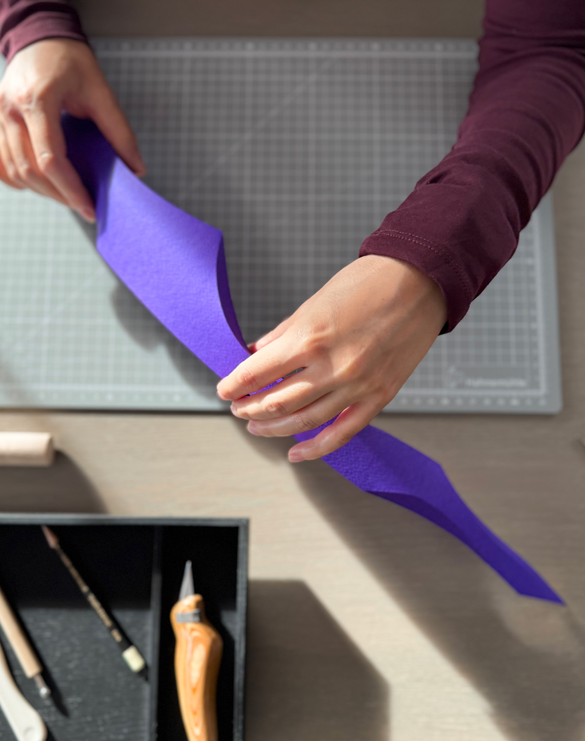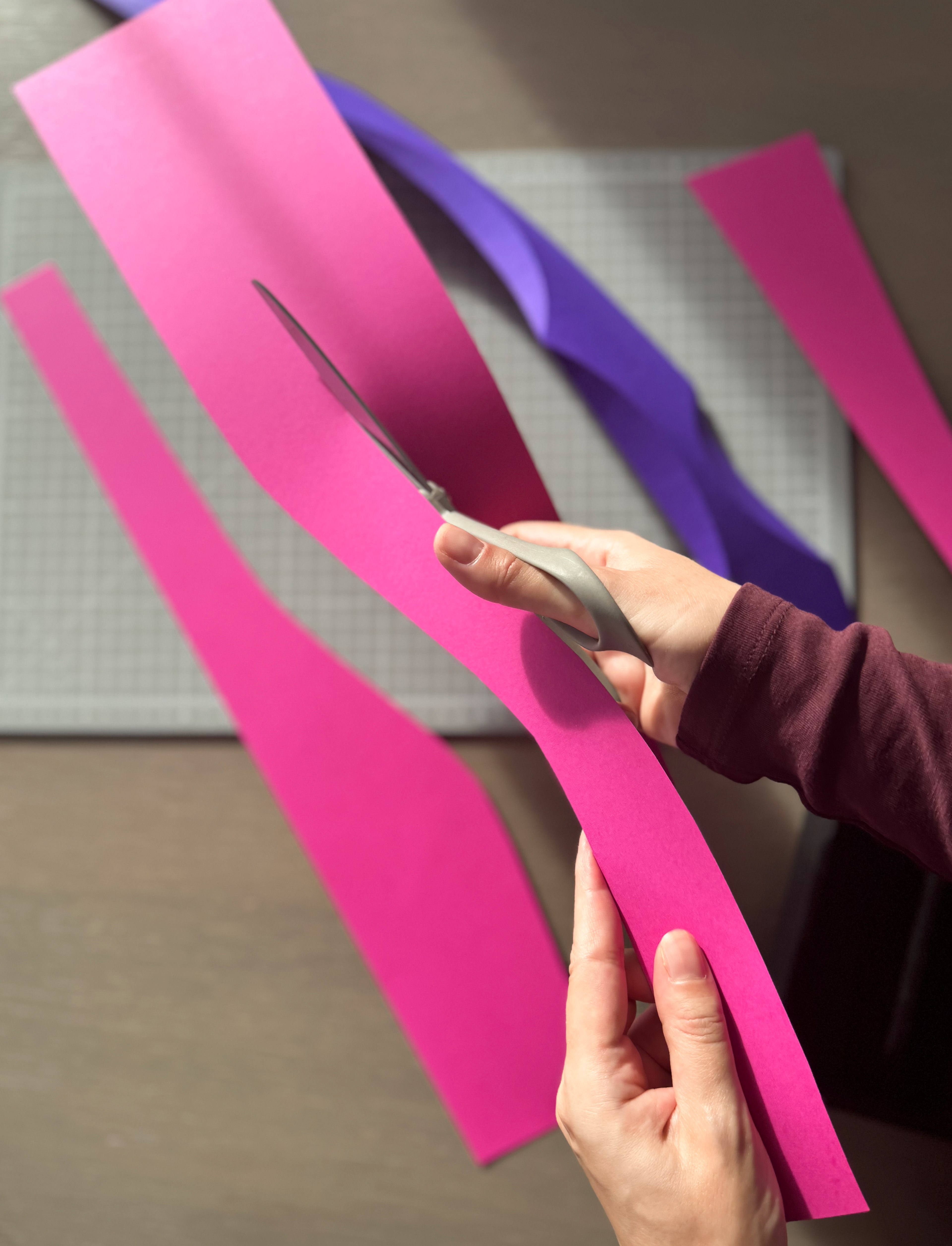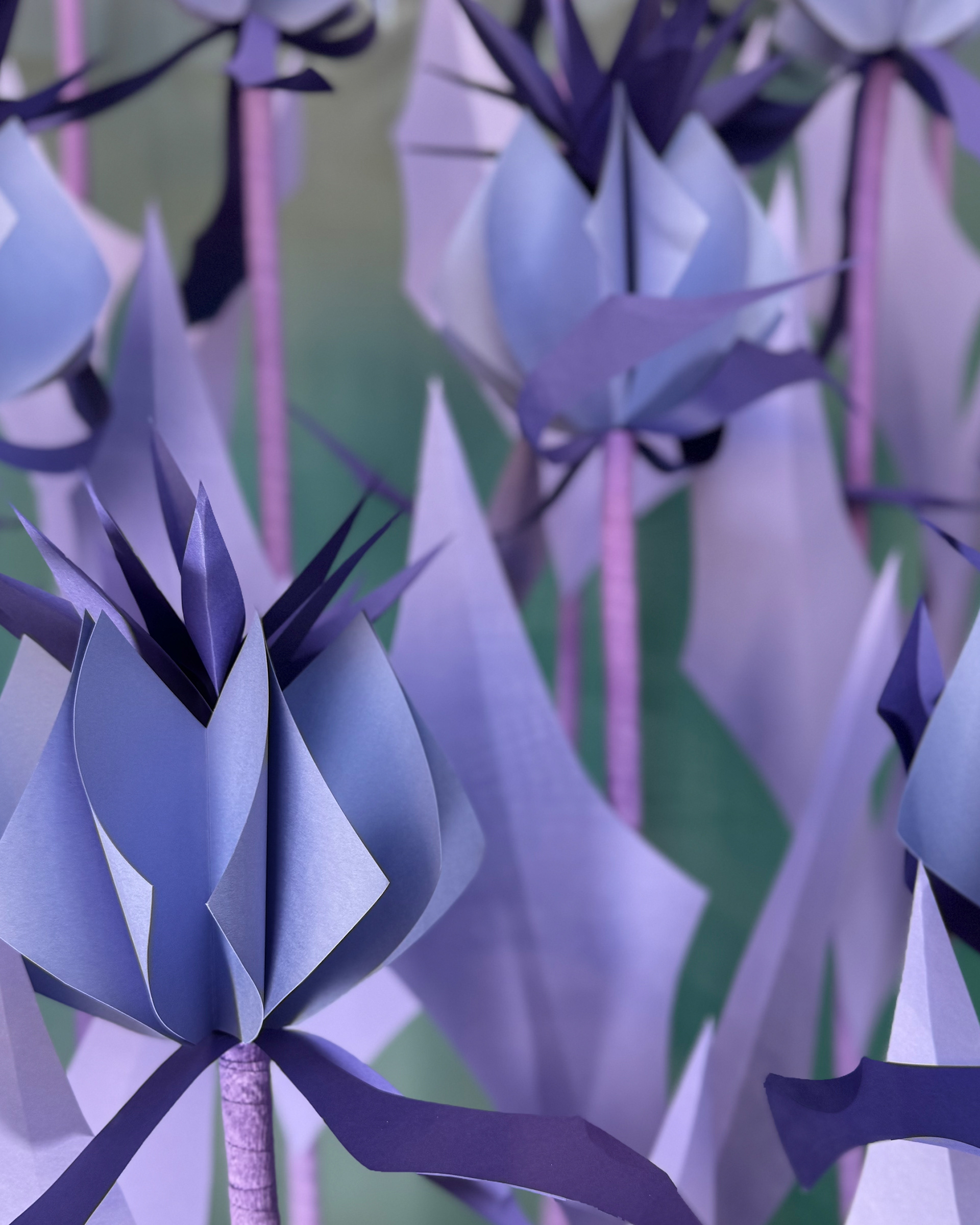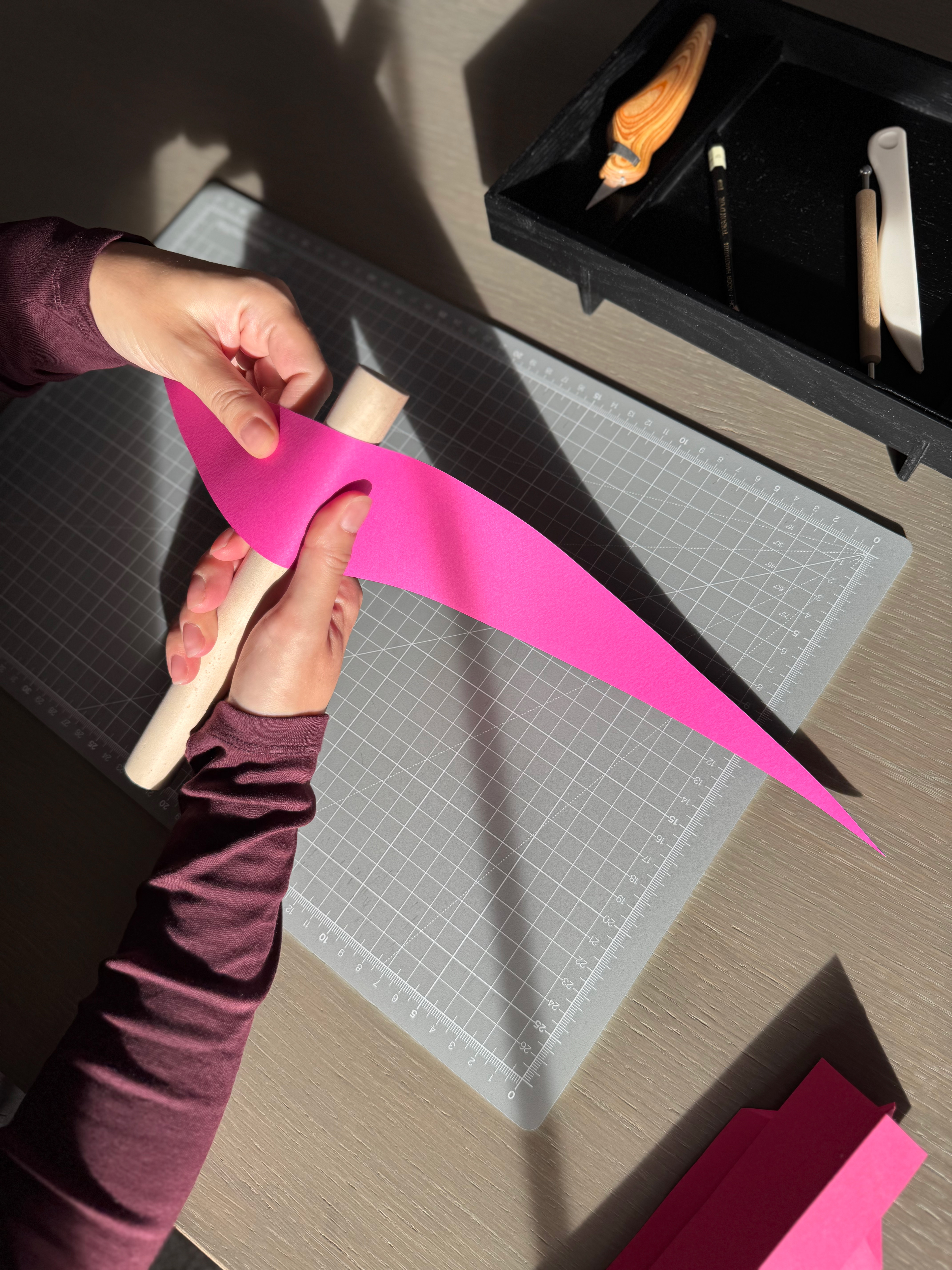 Every element was made by hand: cutting and folding, then sculpting paper with light in mind so a single sheet could reveal a full range of tonal nuances. I designed the installations for real viewing conditions — movement, sightlines, and depth — and built the project around intense, clean colors (fuchsia, scarlet, violet) to reflect the characters’ bold personalities.